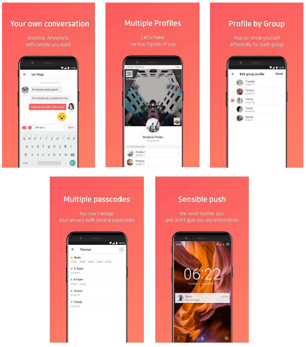 | 청구항 1 메신저 서비스 제공 서버에서 실행되는 메신저 서비스 제공 방법에 있어서, 사용자 단말로부터 이메일 계정 및 비밀번호를 입력받아 상기 사용자 단말을 등록하는 단계; 상기 사용자 단말로부터 적어도 하나의 프로필을 생성하는 다중 프로필 생성 이벤트를 수신하는 단계; 상기 다중 프로필 생성 이벤트에 포함된 프로필 사진, 및 프로필 이름을 지정받고, 상기 프로필이 노출될 그룹을 디폴트로 설정하는 단계; 상기 사용자 단말로부터 상기 생성된 다중 프로필 중 어느 하나의 프로필이 노출될 그룹을 연락처를 통하여 입력받아 그룹을 생성하는 단계; 상기 생성된 그룹에 상기 어느 하나의 프로필을 매핑하여 상기 디폴트로 설정된 그룹을 업데이트하는 단계; 상기 생성된 그룹의 메세지를 활성화할 패스코드를 상기 사용자 단말로부터 입력받아 상기 생성된 그룹과 매핑되도록 저장하는 단계; 상기 사용자 단말로부터 복수의 그룹별로 알람표시 시간 및 장소를 설정받는 단계; 상기 알람표시 시간 또는 장소 이외의 시간 또는 장소에서 상기 복수의 그룹별 메세지가 발생하는 경우, 상기 사용자 단말로 상기 그룹별 메세지를 전송하지 않도록 상기 메신저 서비스 제공 서버단에서 상기 발생된 메세지를 홀딩하는 단계; 상기 알람표시 시간 또는 장소와 일치하는 시간 또는 장소인 경우, 상기 홀딩한 그룹별 메세지를 상기 사용자 단말로 전송하는 단계; 및 상기 사용자 단말로부터 생성된 그룹이 선택되고 상기 생성된 그룹과 매핑되어 저장된 패스코드가 입력되는 경우, 상기 생성된 그룹 내에서 발생된 메세지를 활성화하여 포어그라운드 모드로 출력하는 단계; 를 포함하고, 상기 그룹 내에서 발생한 메세지에 포함된 텍스트는, OS(Operating System)의 메세지 애플리케이션에서 수신만 하는 상태로 백그라운드 모드로 출력되어 상기 사용자 단말의 알림에 표시되지 않고, 상기 사용자 단말에 저장된 연락처로 메신저 연동을 수행하지 않고, 다른 사용자 단말에서 상기 사용자 단말을 추가하는 경우, 또는 사용자 단말에서 다른 사용자 단말을 추가하는 경우, 위치가 동일할 것을 조건으로 아이디 입력, QR 코드 스캔이 된 경우 추가가 가능하고, 상기 사용자 단말에서 복수의 그룹을 설정하는 경우, 각 그룹은 동등한 레벨을 가진 2진 트리형 또는 하나의 그룹 내의 하위 레벨을 가지는 복수의 그룹을 포함하고, 상기 하위 레벨을 가지는 각 하위 그룹에 공통적으로 적용하는 사항과, 각 하위 그룹별로 나누어 적용하는 사항이 각각 분리되는 것인, 다중 프로필 및 지정 그룹채팅 호출을 이용한 메신저 서비스 제공 방법. 청구항 10 제 1 항, 제 3 항, 제 5 항, 제 6 항, 제 8 항 및 제 9 항 중 어느 한 항의 방법을 실행하기 위하여 매체에 저장된 애플리케이션. |