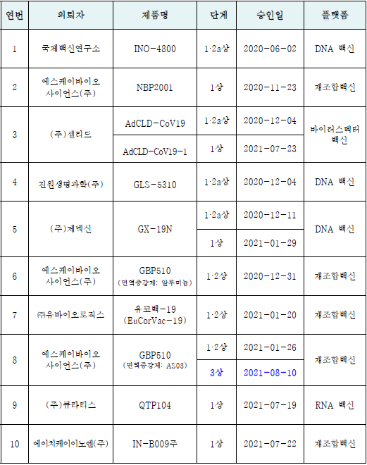 2021년 8월 10일 기준으로 한국의 코로나19 백신 임상 현황은 아래 표(위의 보도자료에서 인용)와 같습니다.