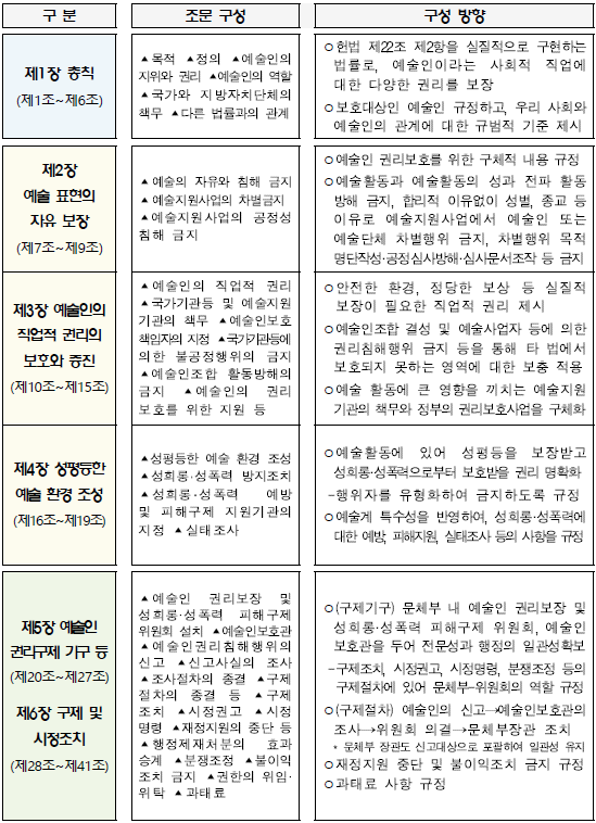 이 법률은 총 6장 41개조 및 부칙으로 구성되어 있습니다(표 인용: 문화체육관광부, 예술인의 권리, 법률로 보장한다, 보도자료, 2021. 8. 31.).