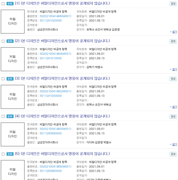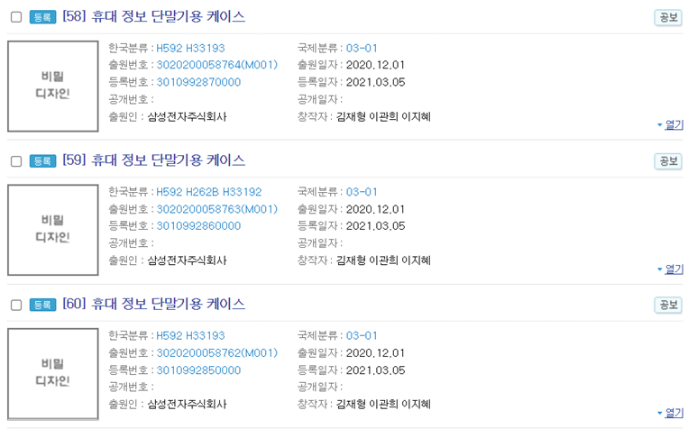아래 그림(출처 : 특허정보넷 키프리스(http://www.kipris.or.kr/) 검색)에서 2021년 4월 1일 전에 등록된 디자인들은 물품의 명칭과 물품류가 공개되었지만, 그 이후의 디자인들은 이것들이 비공개로 처리된 것을 알 수 있습니다.