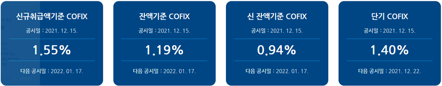 은행연합회는 지난 2021년 12월 15일에 COFIX 기준금리를 발표하였습니다. 은행연합회 사이트에 공시된 것은 아래와 같습니다(출처 : https://portal.kfb.or.kr/fingoods/cofix.php). 이에 따르면 신규취급금액기준 COFIX은 1.55%로 지난 11월 15일에 비해 0.26% 인상되었습니다.