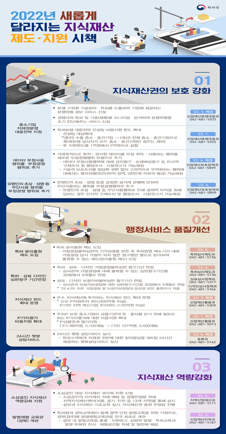 □ 특허청(청장 김용래)은 이 같은 내용을 담은 2022년 새해 달라지는 제도를 ▲지식재산권 보호 강화 ▲행정서비스 품질개선 ▲지식재산 역량강화 등 3개 분야로 나눠 소개했다.