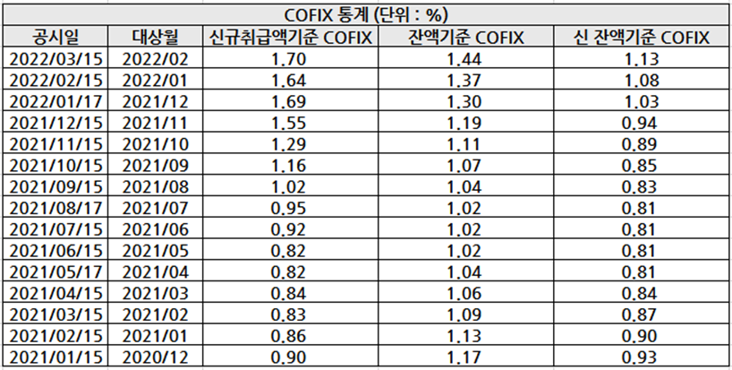 - 2022.02.16 2월 15일 자 COFIX 기준금리, 0.05% 인하