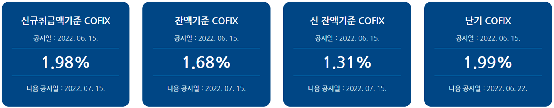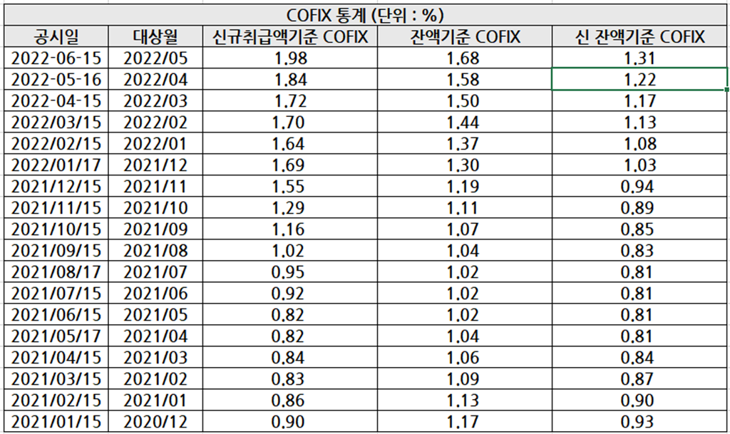 은행엽합회는 2022년 6월 15일0에 COFIX 기준금리를 발표하였습니다. 은행연합회 사이트에 공시된 것은 아래와 같습니다(출처: https://portal.kfb.or.kr/fingoods/cofix.php), 이에 따르면 신규취급금액기준 COFIX는 1.98%로 지난 2022년 5월 16일에 비해 0.14% 인상되었습니다. 그리고 잔액기준 COFIX 및 신 잔액기준 COFIX의 경우도 각각 0.10%와 0.09% 인상되었습니다.