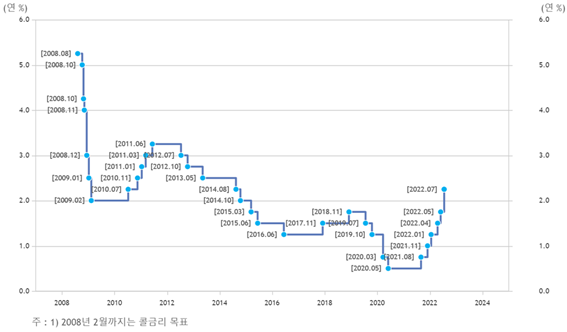 2022년 7월 13일 금융통화위원회는 다음 통화정책방향 결정시까지 한국은행 기준금리를 1.75%에서 2.25%로 0.5%p 상향 조정하여 통화정책을 운용하기로 하였습니다. 이는 지난 2014년 8월 14일 수준의 기준금리입니다.