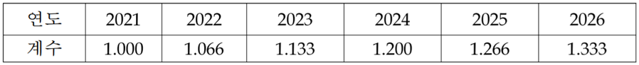 | 음악저작물 사용료 징수규정 제24조(영상물 전송서비스) ① 음악저작물이 주된 목적으로 이용되는 영상물(음악 예능, 공연 실황 등)을 전송서비스하는 경우, 사용료는 다음 중 많은 금액으로 한다. 1. 매출액×3.0%(음악사용요율) ×연차계수×음악저작물관리비율 2. 월정 210원(가입자 당 단가)×가입자 수×음악저작물관리비율 ② 음악저작물이 부수적인 목적으로 이용되는 영상물(제1항 이외의 일반 예능, 드라마, 영화 등)을 전송서비스하는 경우, 사용료는 다음 중 많은 금액으로 한다. 1. 매출액×1.5%(음악사용요율) ×연차계수×음악저작물관리비율 2. 월정 105원(가입자 당 단가)×가입자 수×음악저작물관리비율 비고1) 사용료 산식의 가입자 당 단가는 해당 연도 사용료 요율에 연동한다. 비고2) 연차계수는 다음과 같다. ![]() |