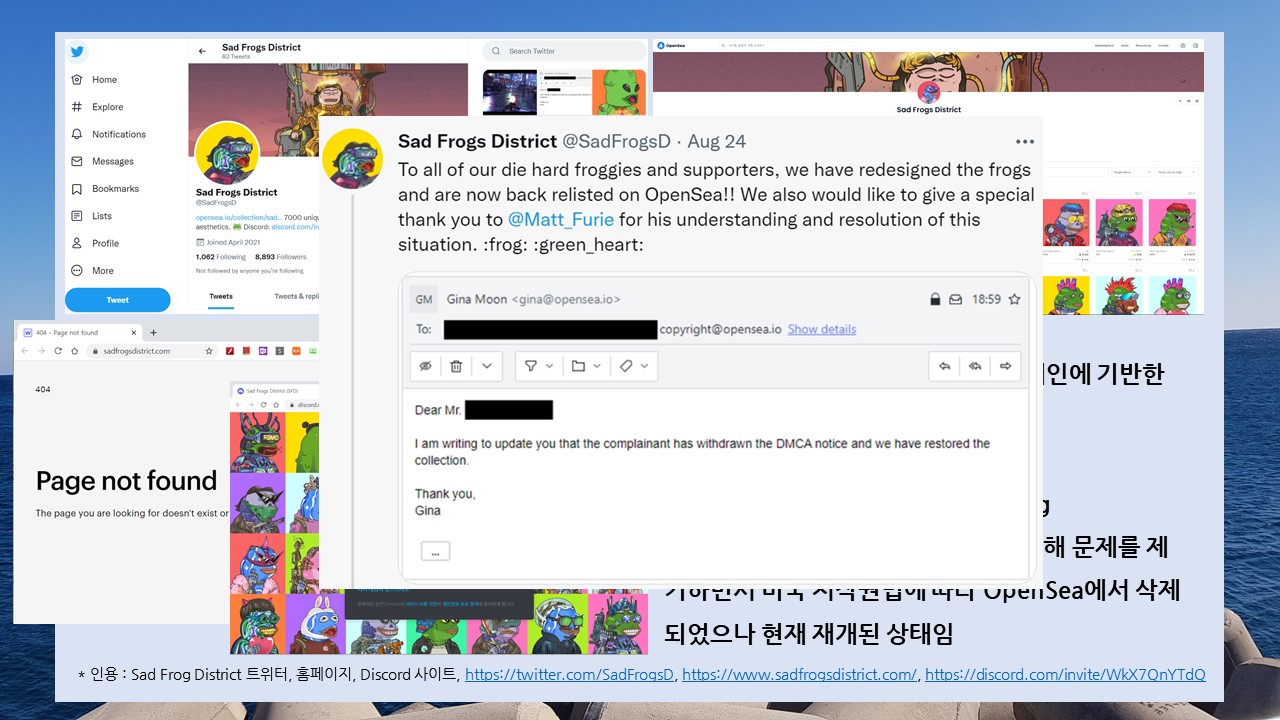 물론 그 이전에도 아트 NFT의 저작권 문제가 지속적으로 지적이 되어 왔고, 지금도 여러 가지 측면에서 논의가 되고 있습니다. 그런 가운데 Sad Frog District가 OpenSea에서 삭제되었다는 것이 상당한 이슈가 되게 된 거예요. 이것이 거래가 되었다는 것이고 그래서 많은 사람들이 금전적으로 손해를 볼 수도 있게 된 상황이었죠. 그래서 사이트도 이렇게 내려가고요.