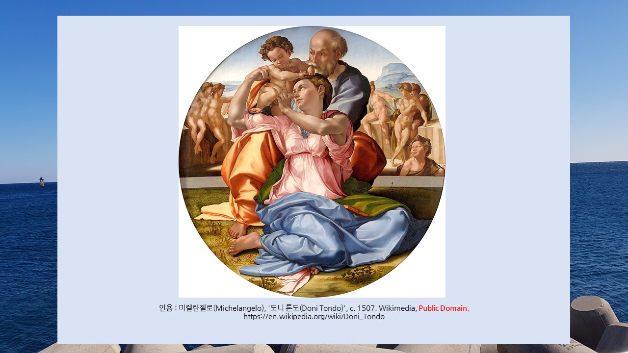 이 그림은 미켈란젤로가 1507년에 그린 도니 톤도라고 하는 그림인데요. 1507년에 그려졌고, 미켈란젤로씨가 벌써 한참 전에 돌아가셨죠. 그래서 이것은 퍼블릭 도메인, 즉 공유 영역에 있는 그림이라고 할 수 있습니다. 만료 저작물이죠.