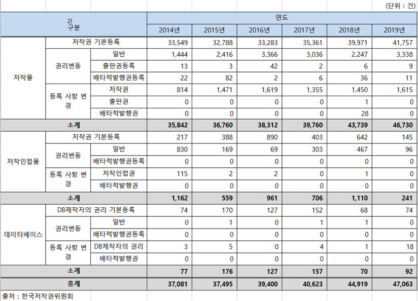 예를 들어 저작권등록과 관련한 자료는 아래와 같이 기술되어 있습니다. 아직 2021년 저작권 통계집이 발간되지 않아 2020년 저작권 통계집의 내용(2019년 기준 통계)입니다.